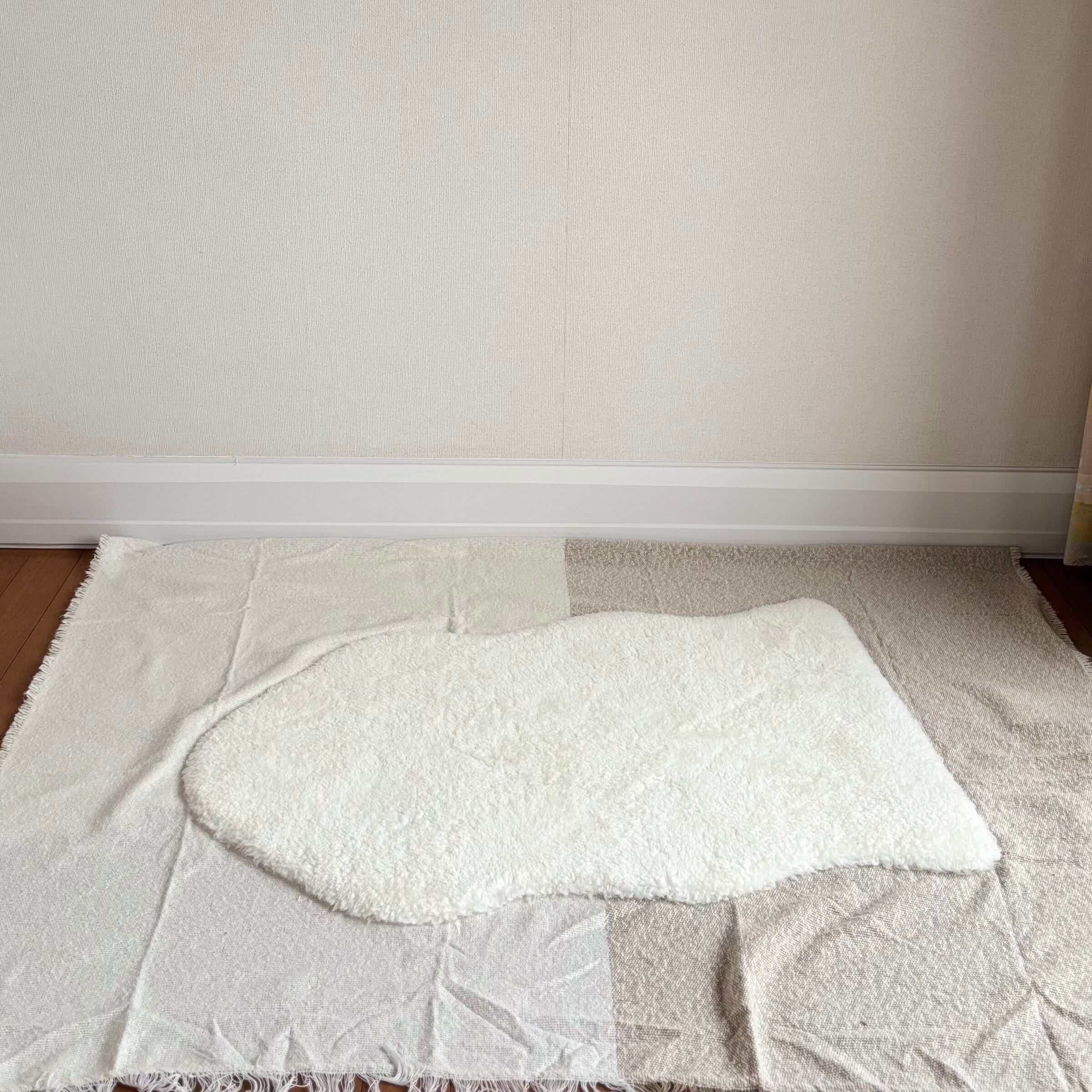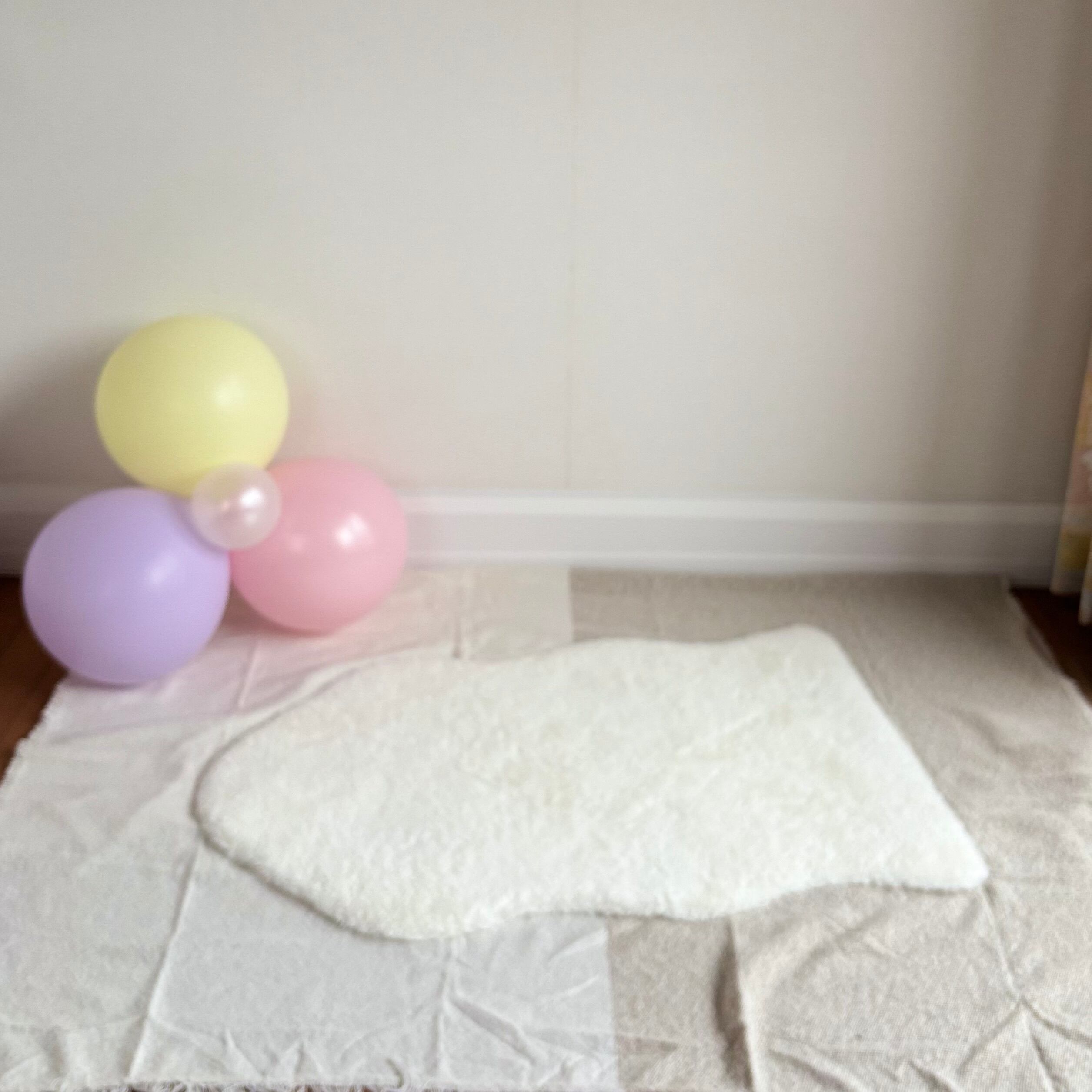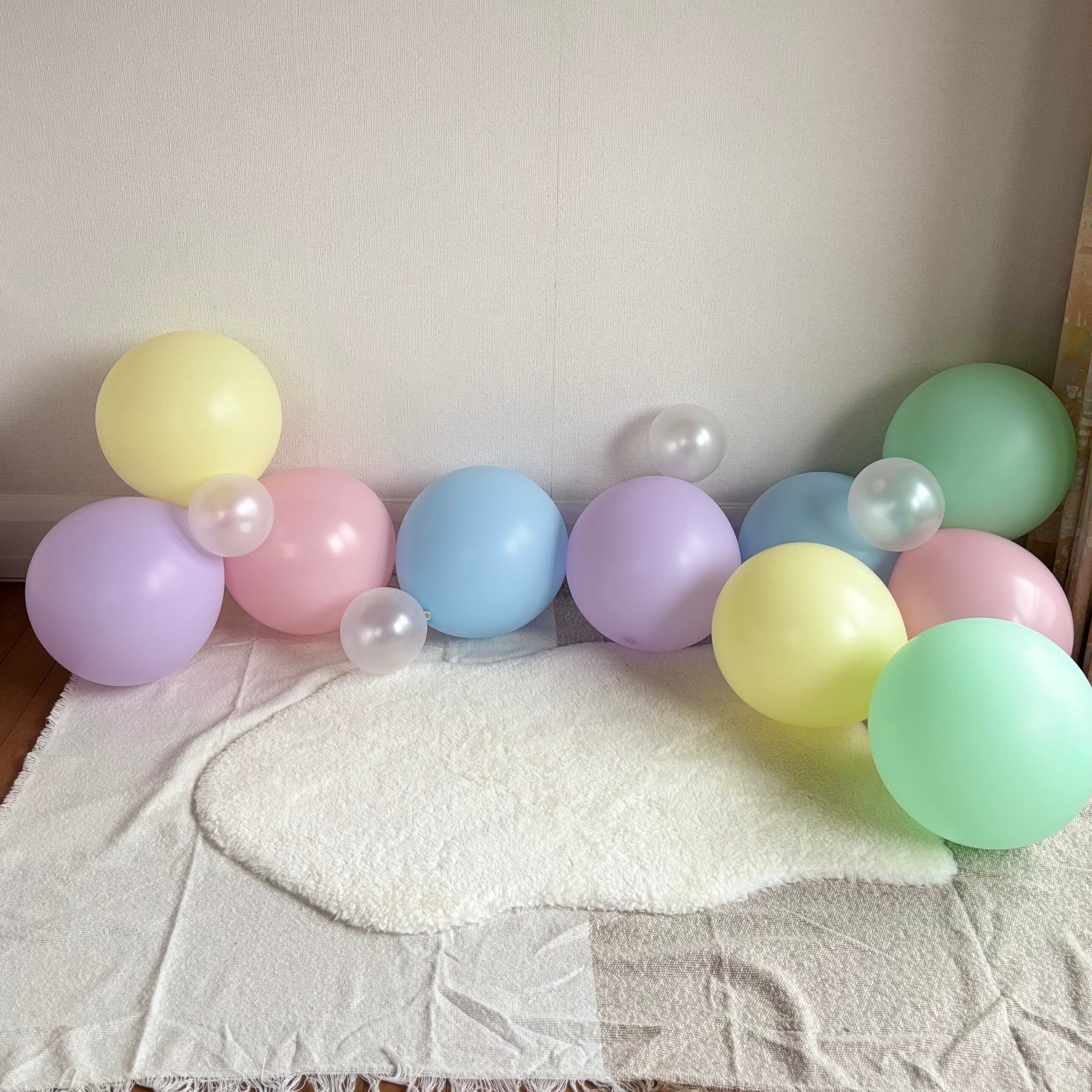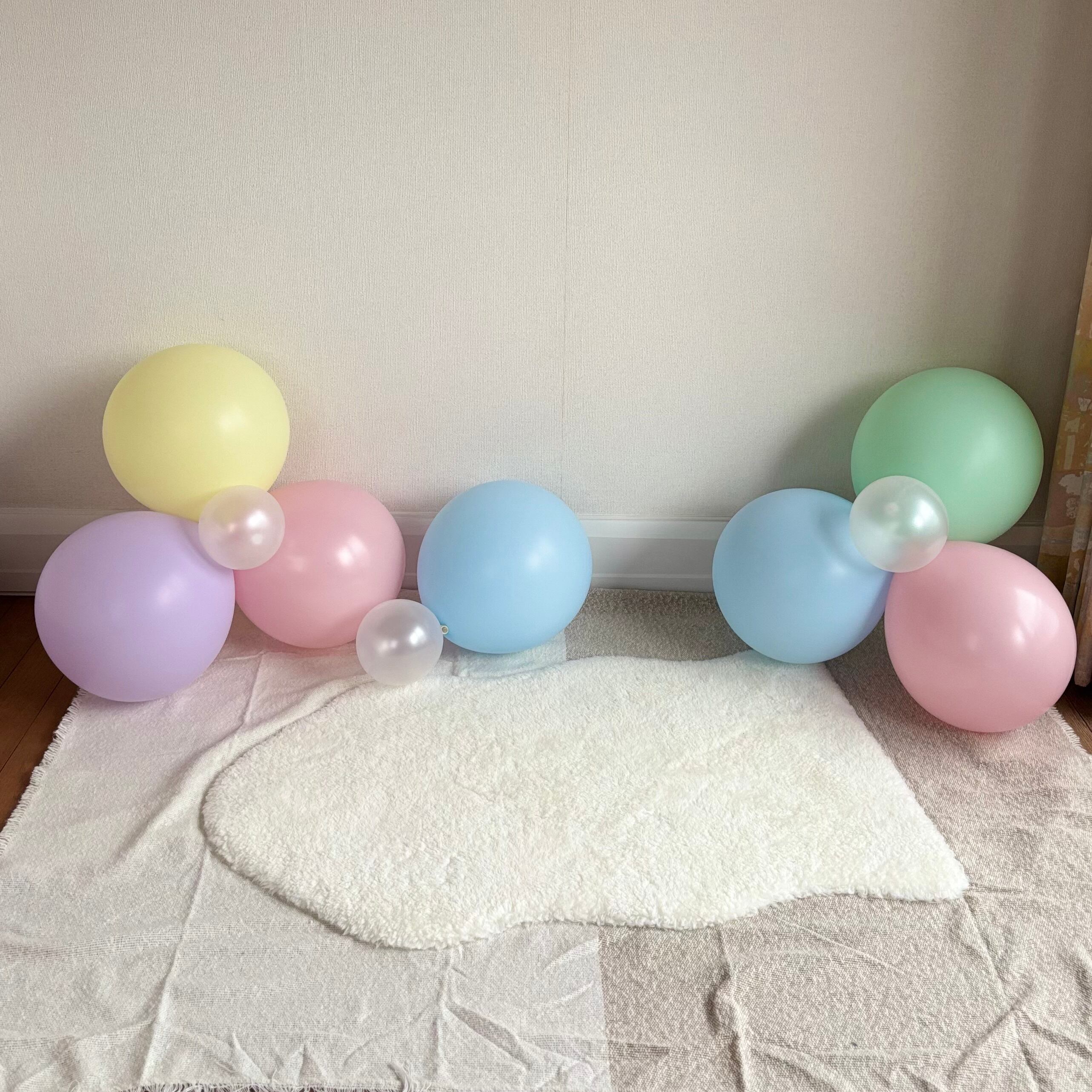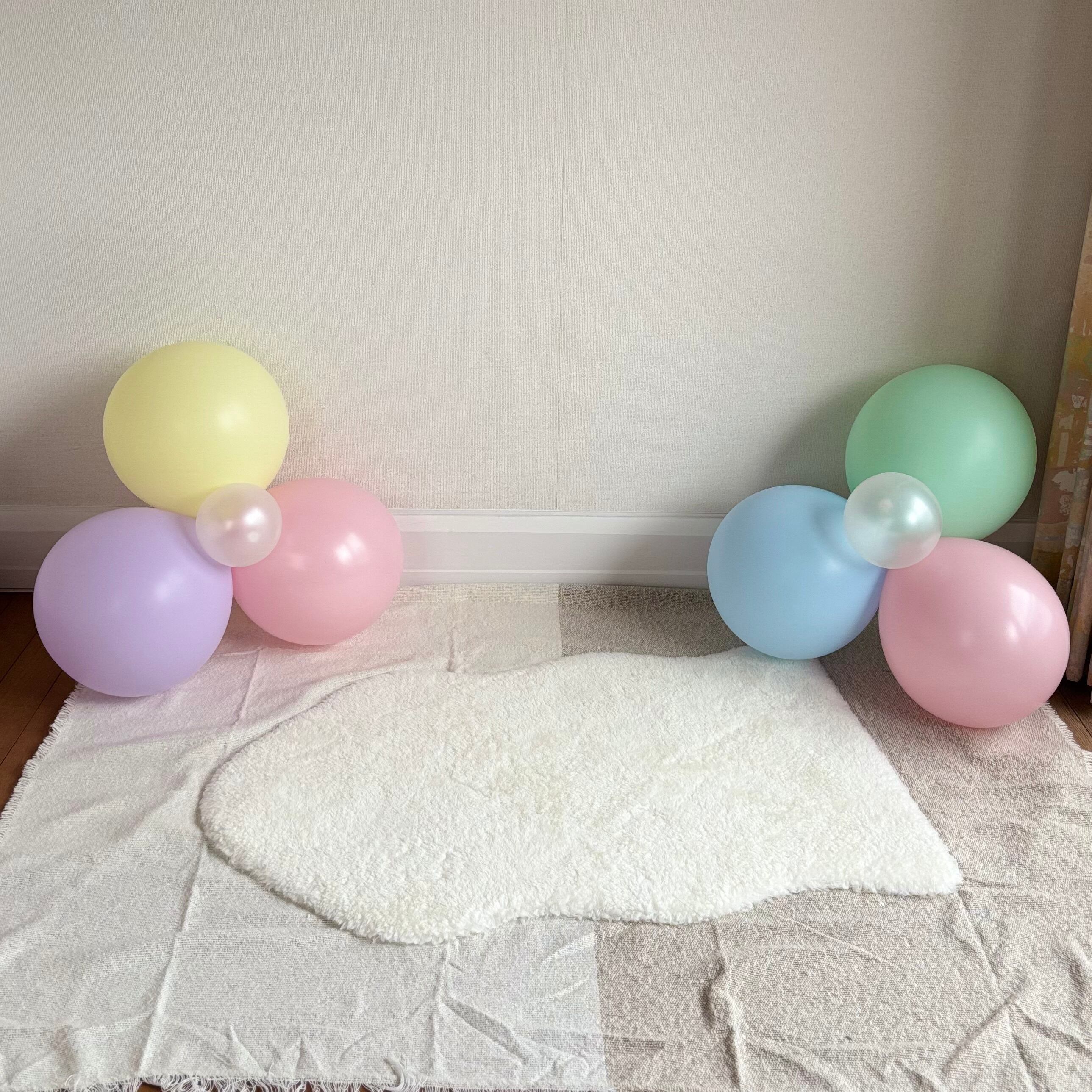 1. バルーンをふくらませて、バランスよく配置(床は白っぽいラグなどを敷くとおシャレに仕上がります)