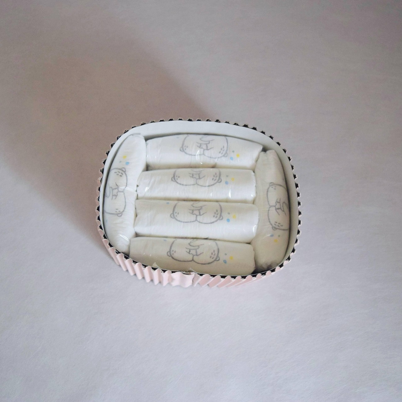ケーキ部分には紙おむつ6枚が入っています。紙おむつは衛生面にも配慮し、一枚ずつビニール袋で個別包装して詰めていますので、安心してご使用いただけます。