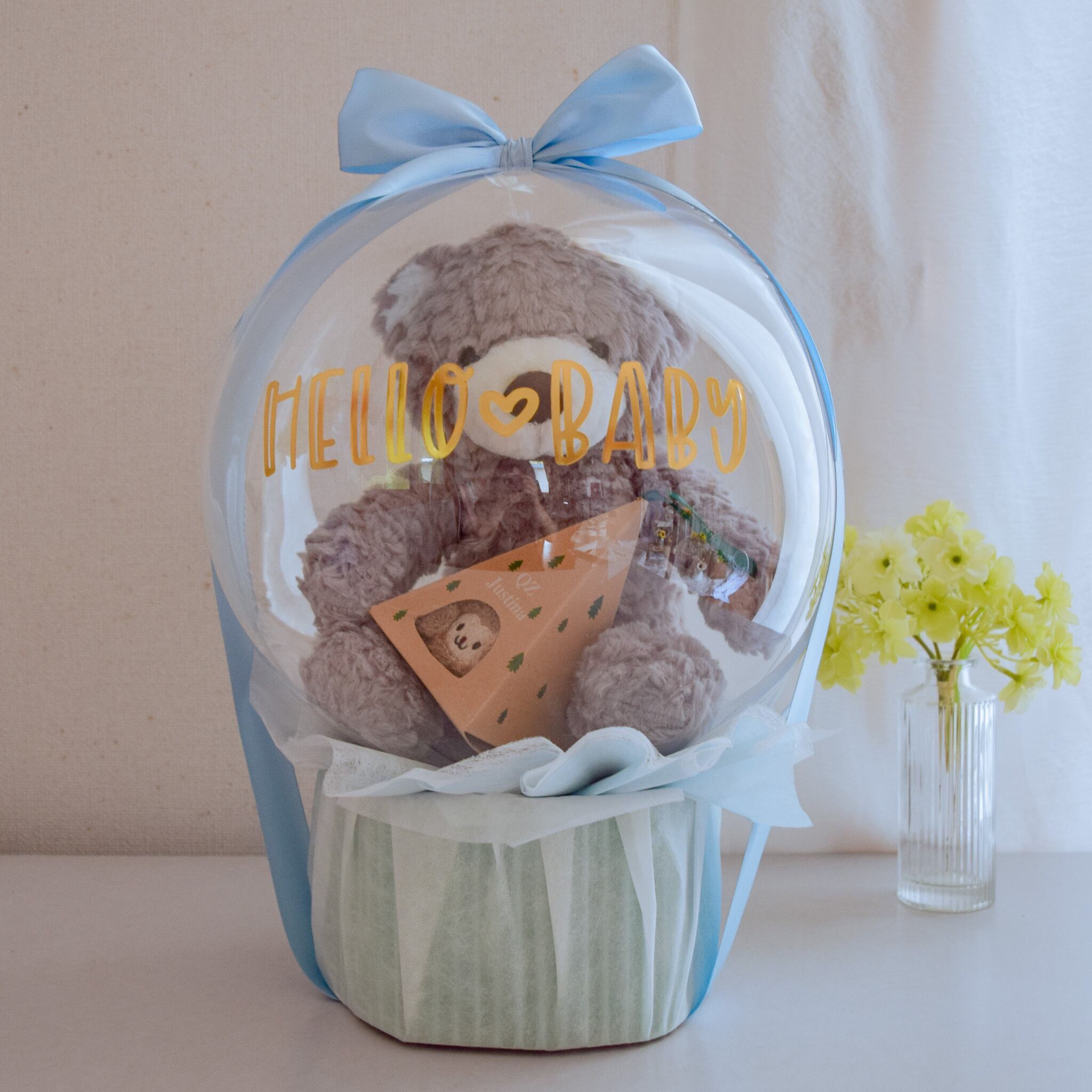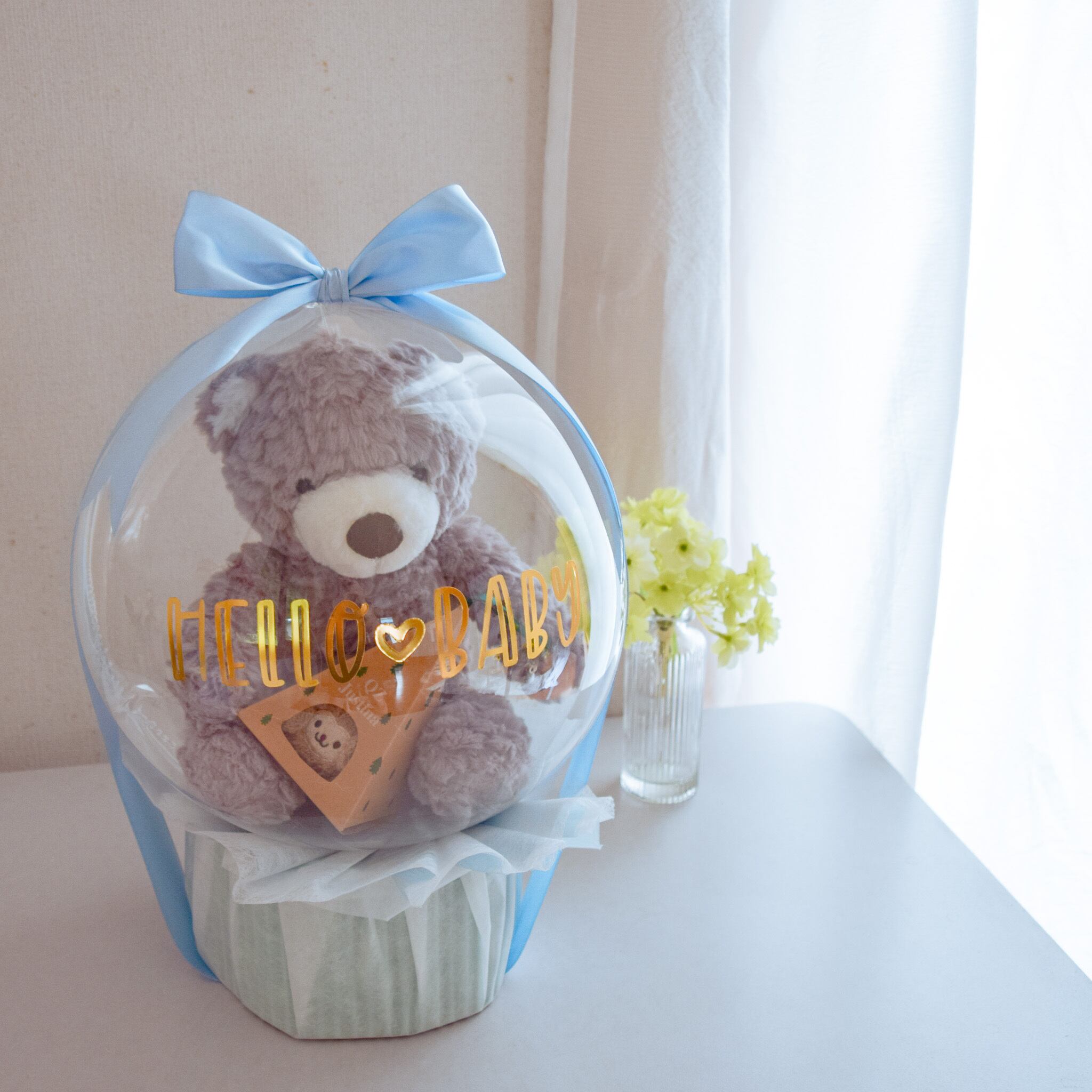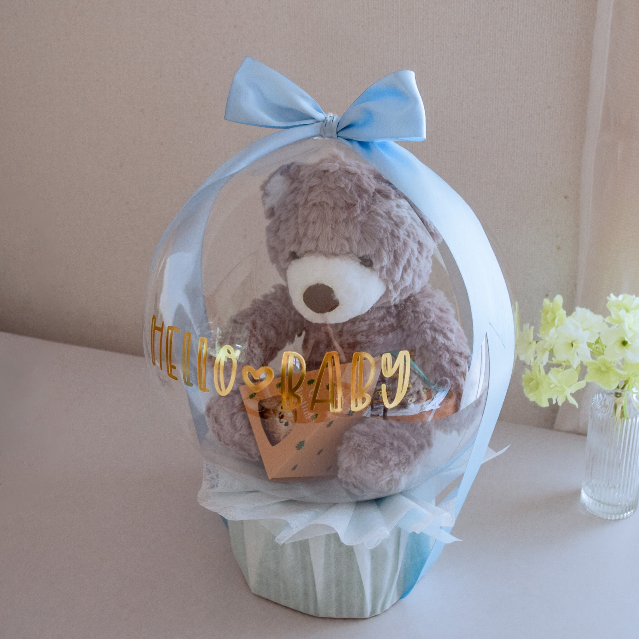 まんまるな透明バルーンに、グレイッシュなくまのぬいぐるみを閉じ込めました。