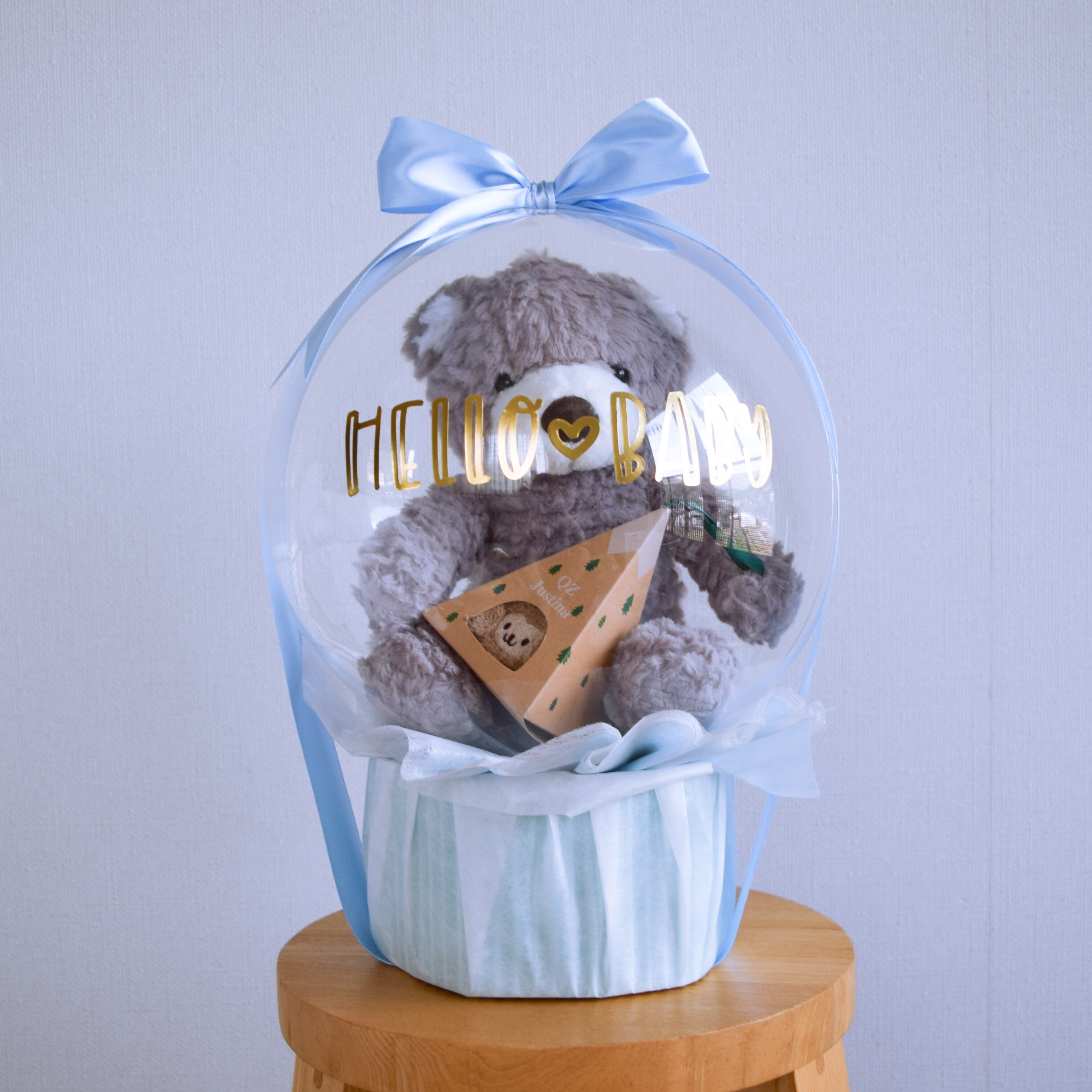 インパクトのある見た目のバルーンをお楽しみいただいた後は、ぬいぐるみと紙おむつを実際にご利用いただける実用的なギフト。